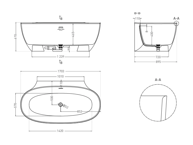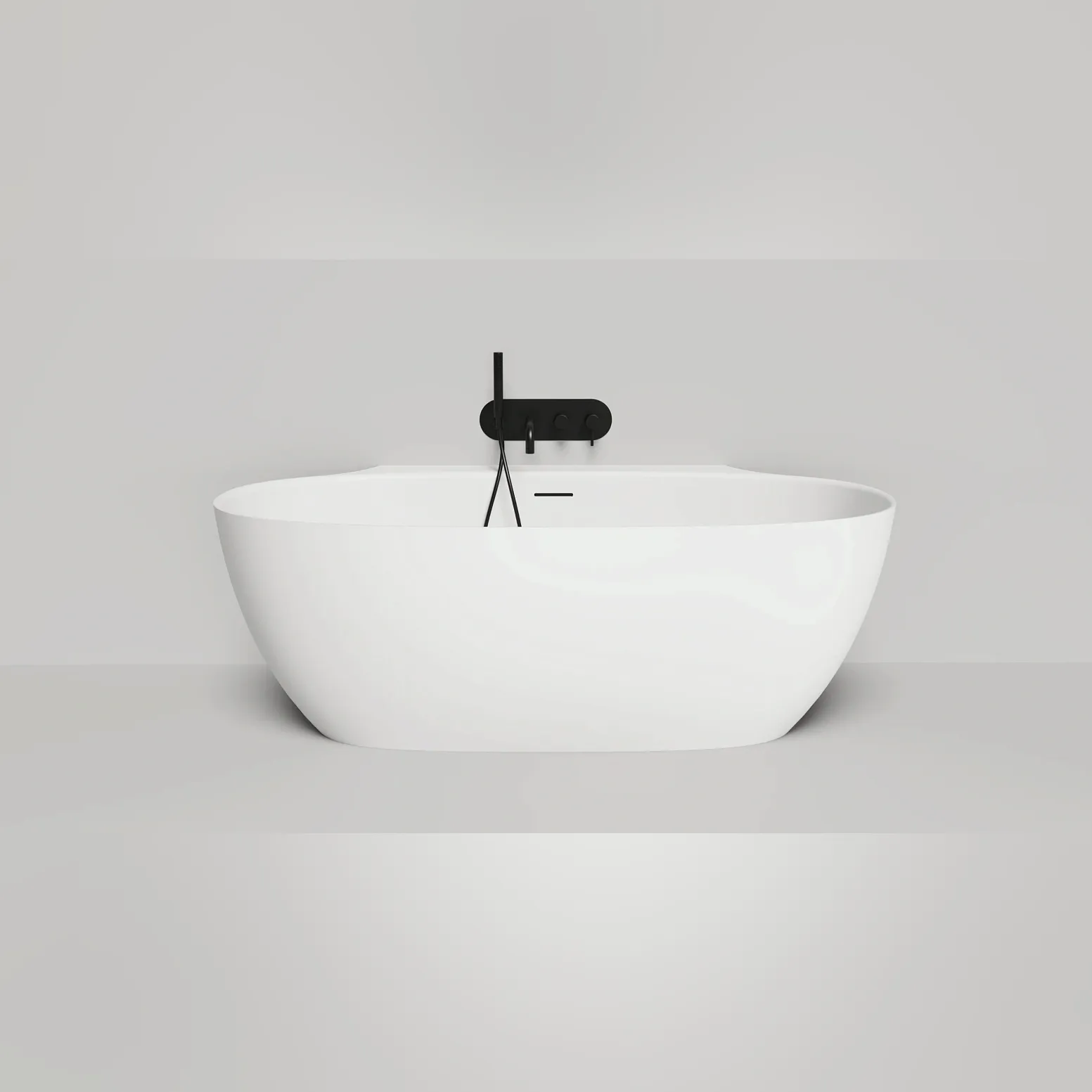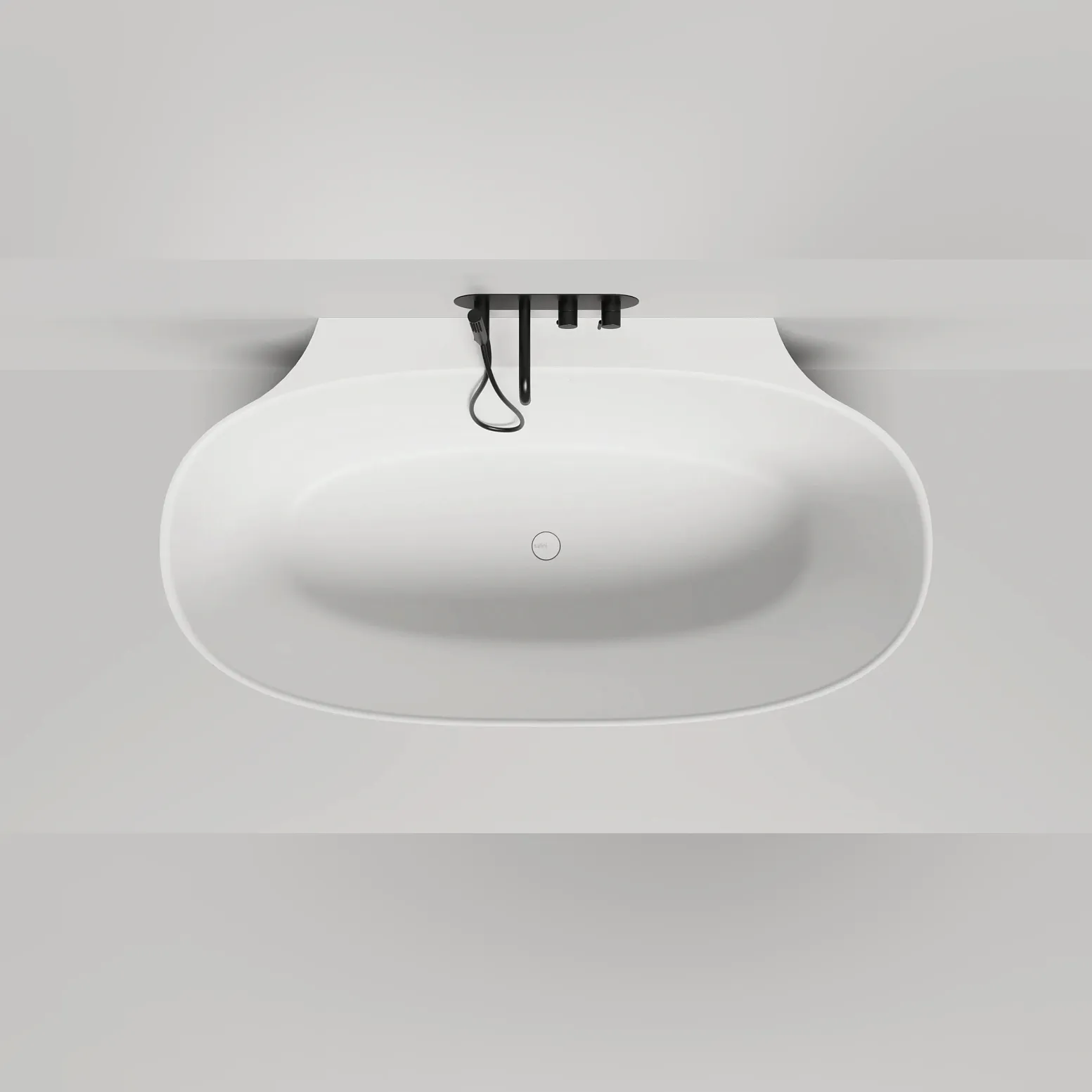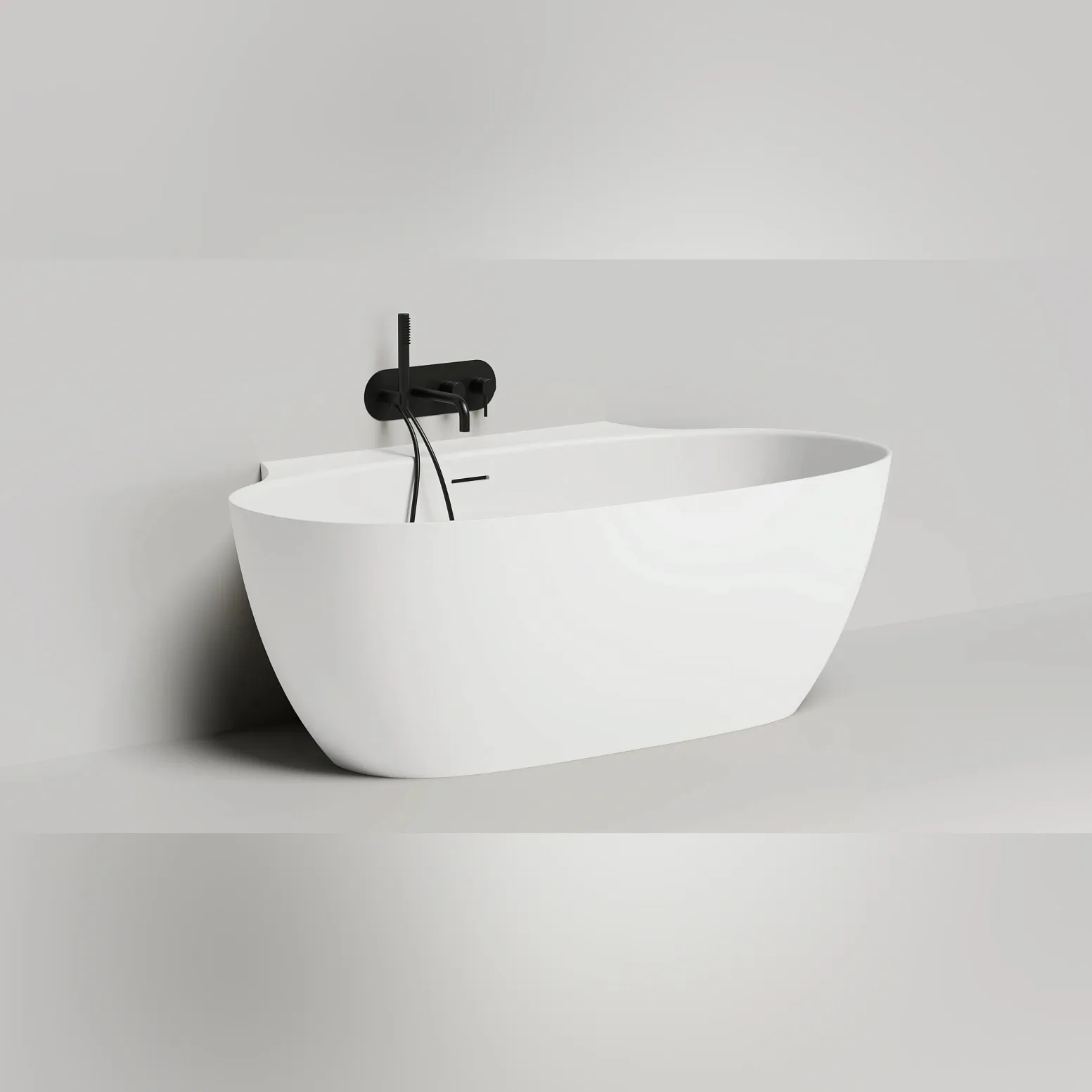 Эта модель соединяет в себе классическую овальную форму изголовий и спрятанный за ними пристенный борт. Благодаря такой конструкции создаётся впечатление отдельностоящей ванны, но сохраняется практичность плотного примыкания к стене и дополнительной поверхности для хранения косметических средств и аксессуаров. При желании здесь также можно разместить и смеситель. Более тонкая, детальная проработка формы чаши позволила уйти от классического понимания пристенной ванны с массивной боковой проекцией: блок, соприкасающийся со стеной, будто утоплен вдоль задней поверхности. Такова новая эстетика облегчённого дизайнерского решения Salini.