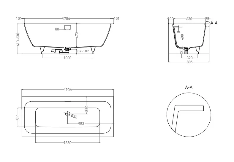 Она предназначена как для полного или частичного встраивания, так и для любой установки — пристенной, угловой или отдельно стоящей. Ванна характеризуется одинаковым уклоном бортов и расположенными посередине сливом-переливом и донным клапаном. Название модели Axis («Ось») отражает характерную симметрию ванны во фронтальной проекции.