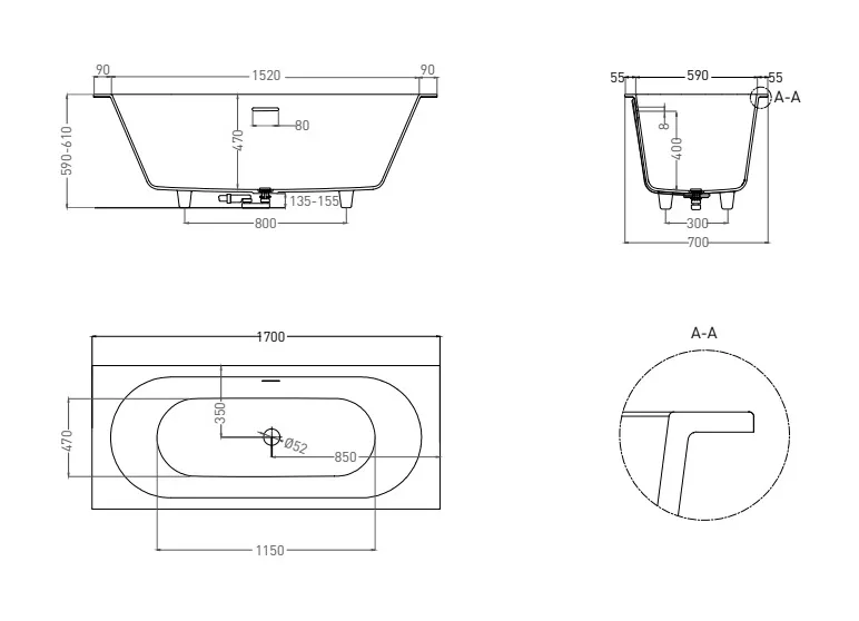 Она предназначена как для полного или частичного встраивания, так и для пристенной или угловой установки. Ванна характеризуется одинаковым уклоном бортов и расположенными посередине сливом-переливом и донным клапаном. Название модели Axis («Ось) отражает характерную симметрию ванны во фронтальной проекции.
