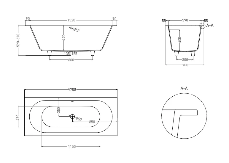 Она предназначена как для полного или частичного встраивания, так и для пристенной или угловой установки. Ванна характеризуется одинаковым уклоном бортов и расположенными посередине сливом-переливом и донным клапаном. Название модели Axis («Ось) отражает характерную симметрию ванны во фронтальной проекции.