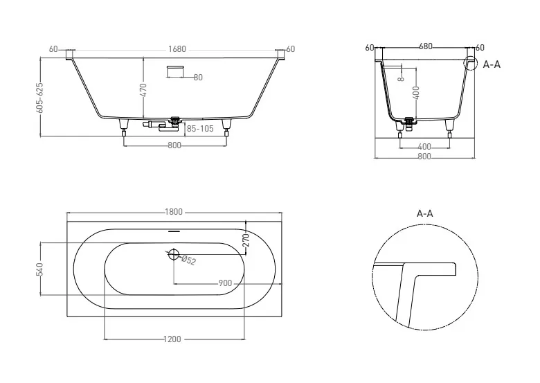 Вневременная эстетика и чистые линии корпуса ванны делают её уместной и желанной как в классическом, так и в современном интерьере. Ванна предназначена для полного или частичного встраивания, а также для любой установки — пристенной, угловой или отдельно стоящей. Модель отличают донный клапан и слив-перелив с центральным расположением.
