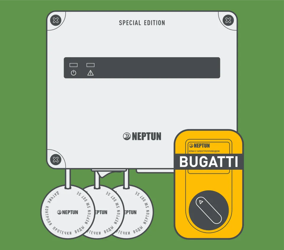 Комплект защиты от протечки воды NEPTUN BUGATTI SE Базовый (1 кран) предназначен для обнаружения и локализации протечек воды и установки в квартиры с газовой колонкой, где подведено только холодное водоснабжение (в комплекте один кран) . Данный комплект построен на основе модуля управления Neptun Base - это простое, но при этом очень надежное устройство. Дополнительных функций не много, но если они Вам и не нужны, то это идеальное решение.