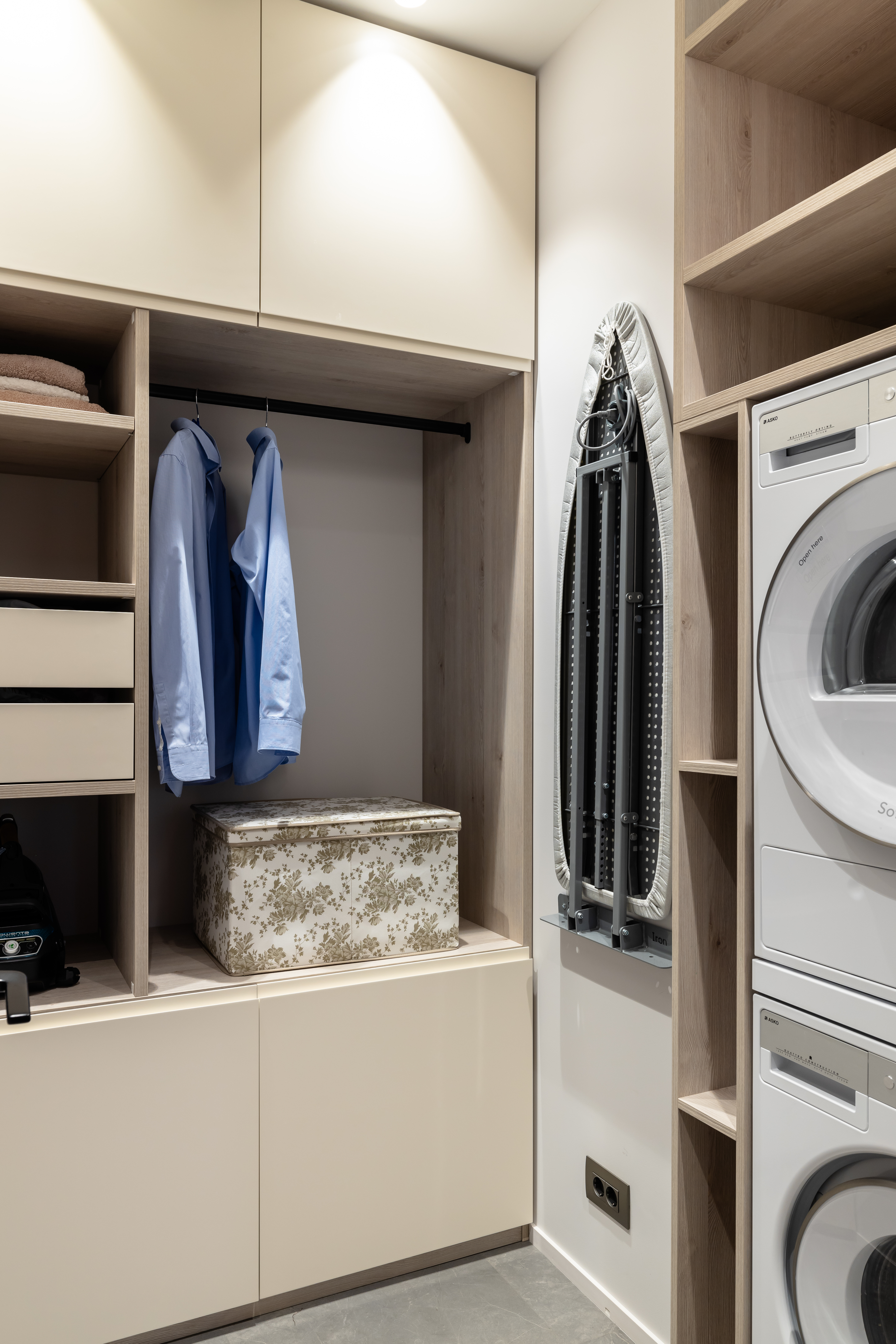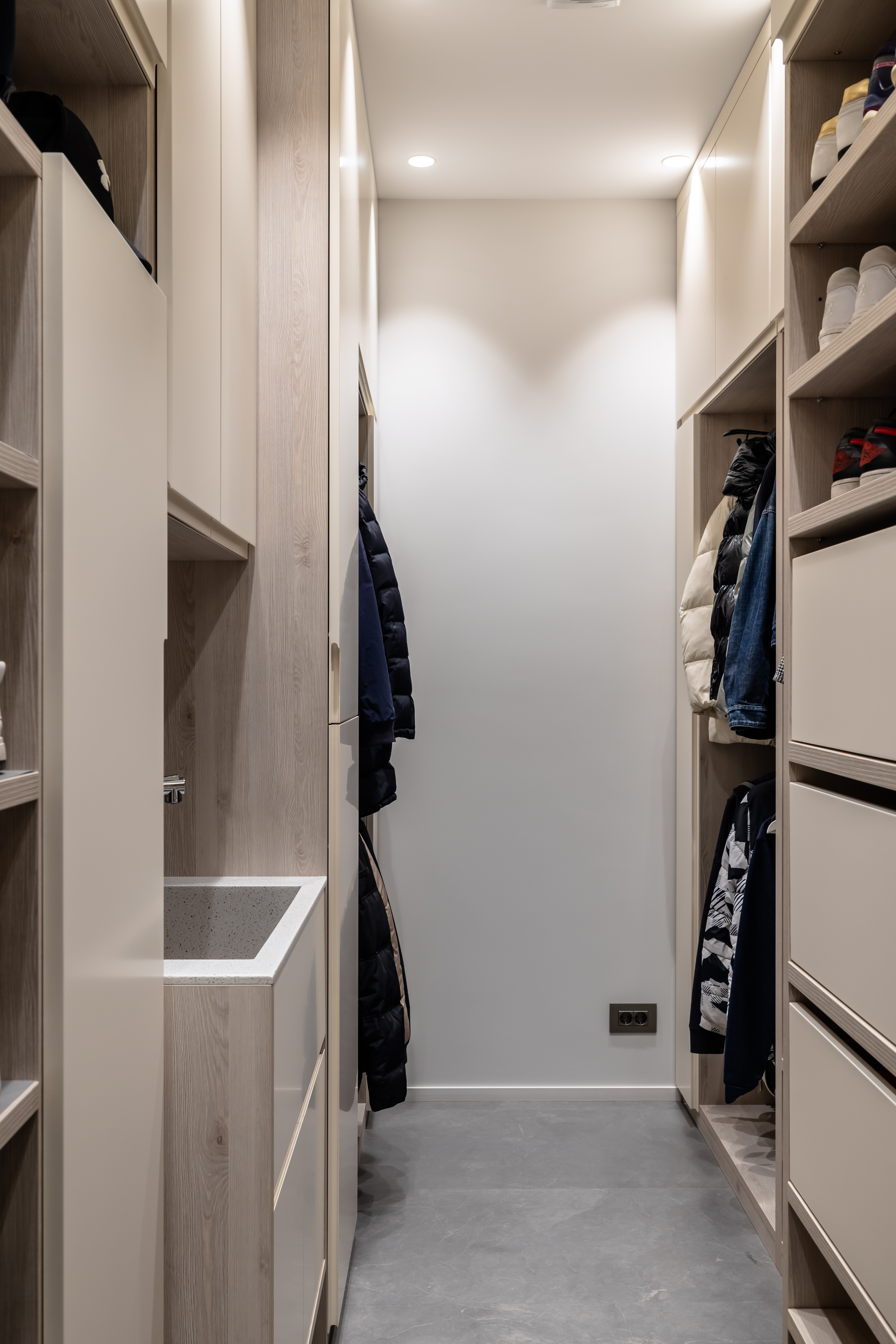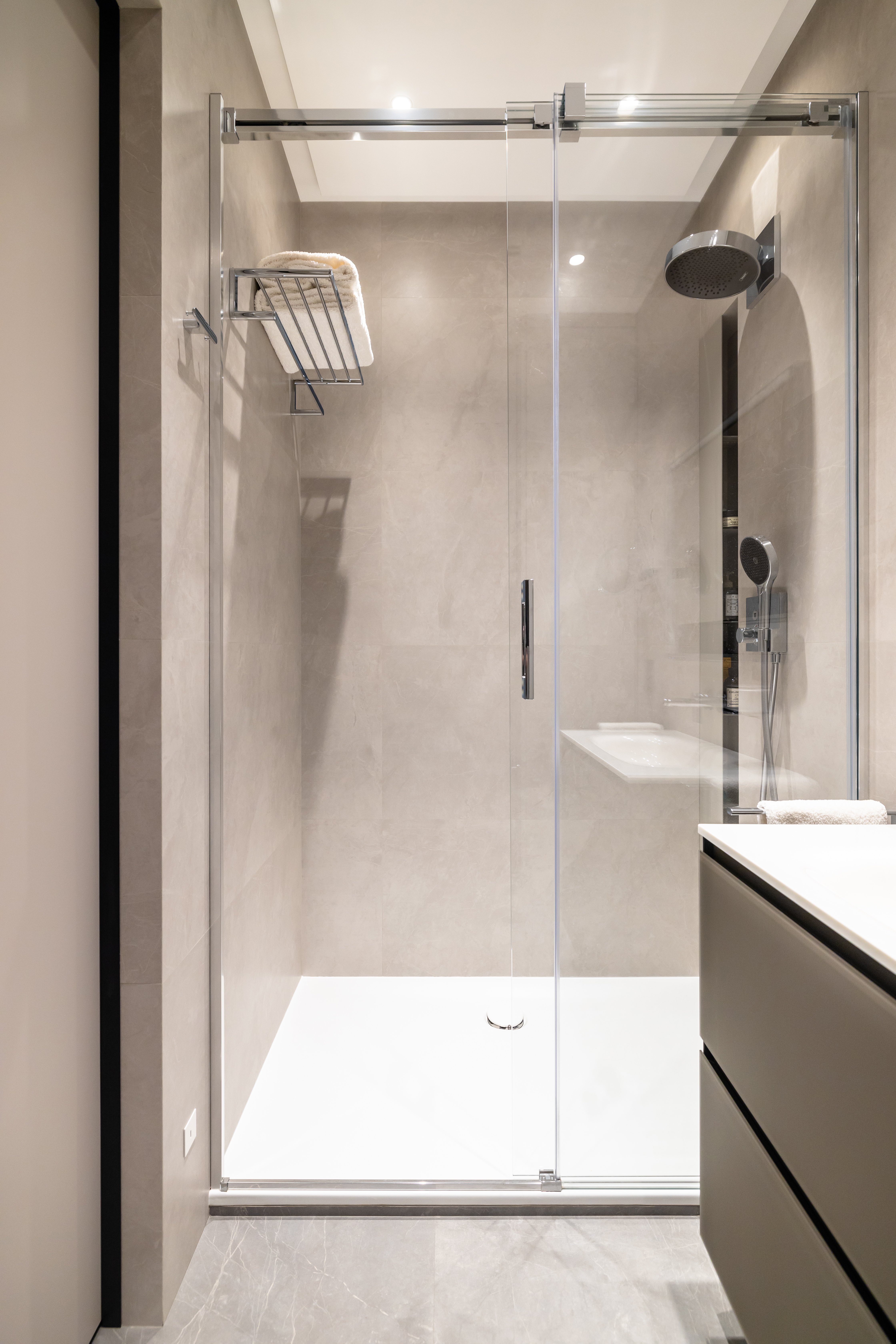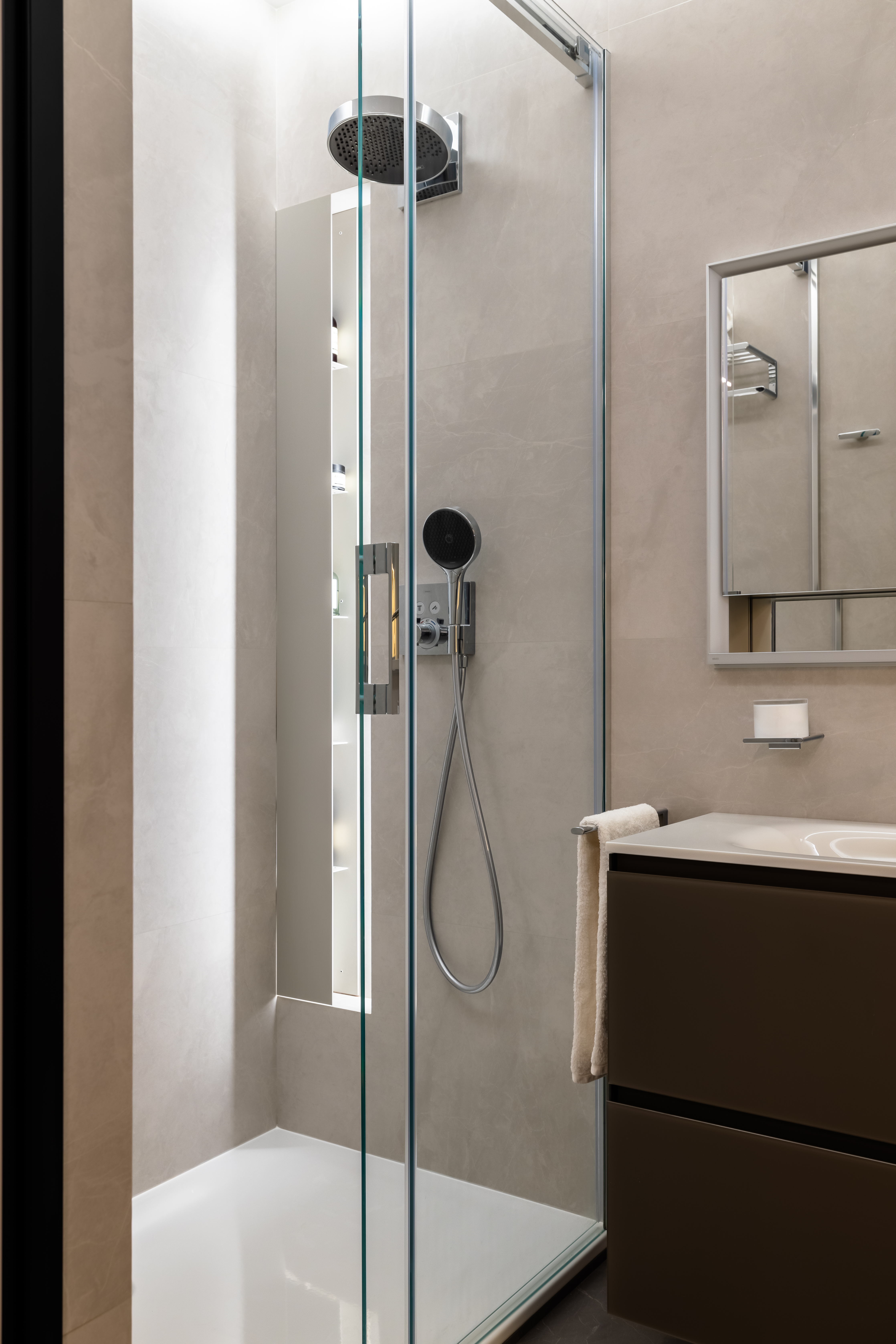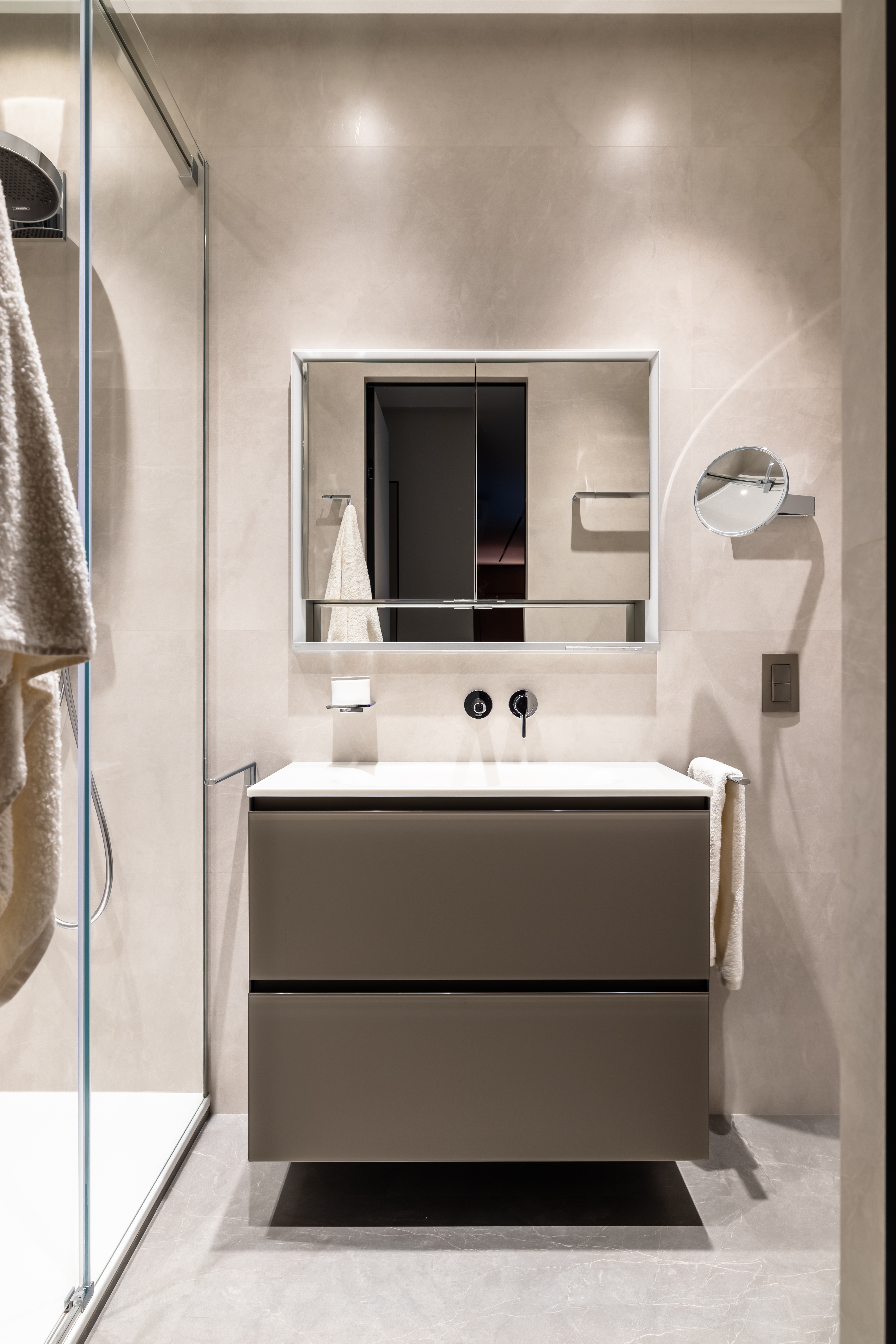 Умывальная зона оформлена с использованием продукции KEUCO — мебели под раковину и зеркала с сенсорной LED-подсветкой и системой антизапотевания. Лаконичные формы, качественные материалы и продуманная эргономика делают зону умывания максимально комфортной. Все аксессуары, включая держатели, дозаторы и крючки, также выполнены KEUCO — благодаря чему интерьер выглядит завершённым и цельным.